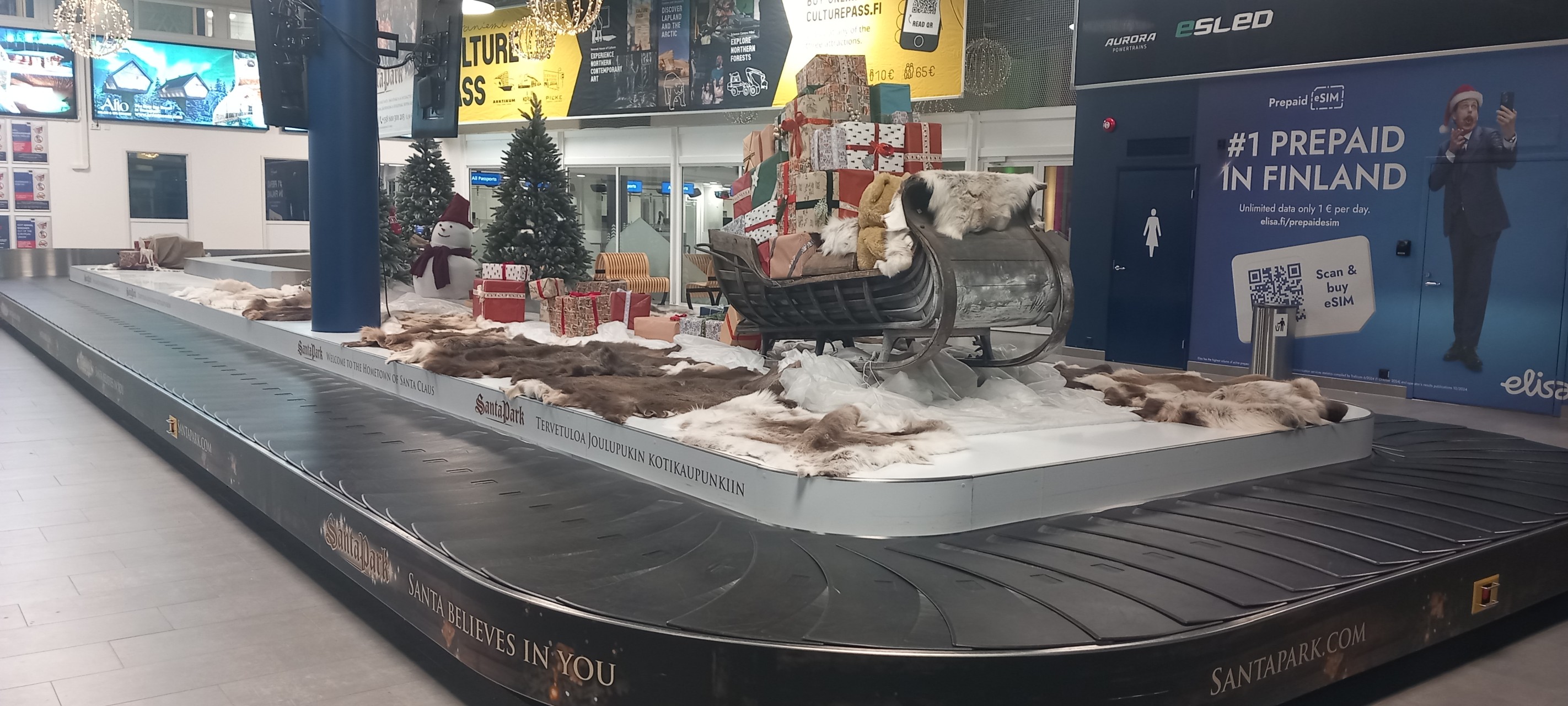 Na een korte vlucht van Schiphol naar Rovaniemi kwamen we aan op een kleine vluchthaven. We konden snel doorlopen naar de bagageband. Al wachtend op onze bagage kwamen we al goed in de kerstsfeer.